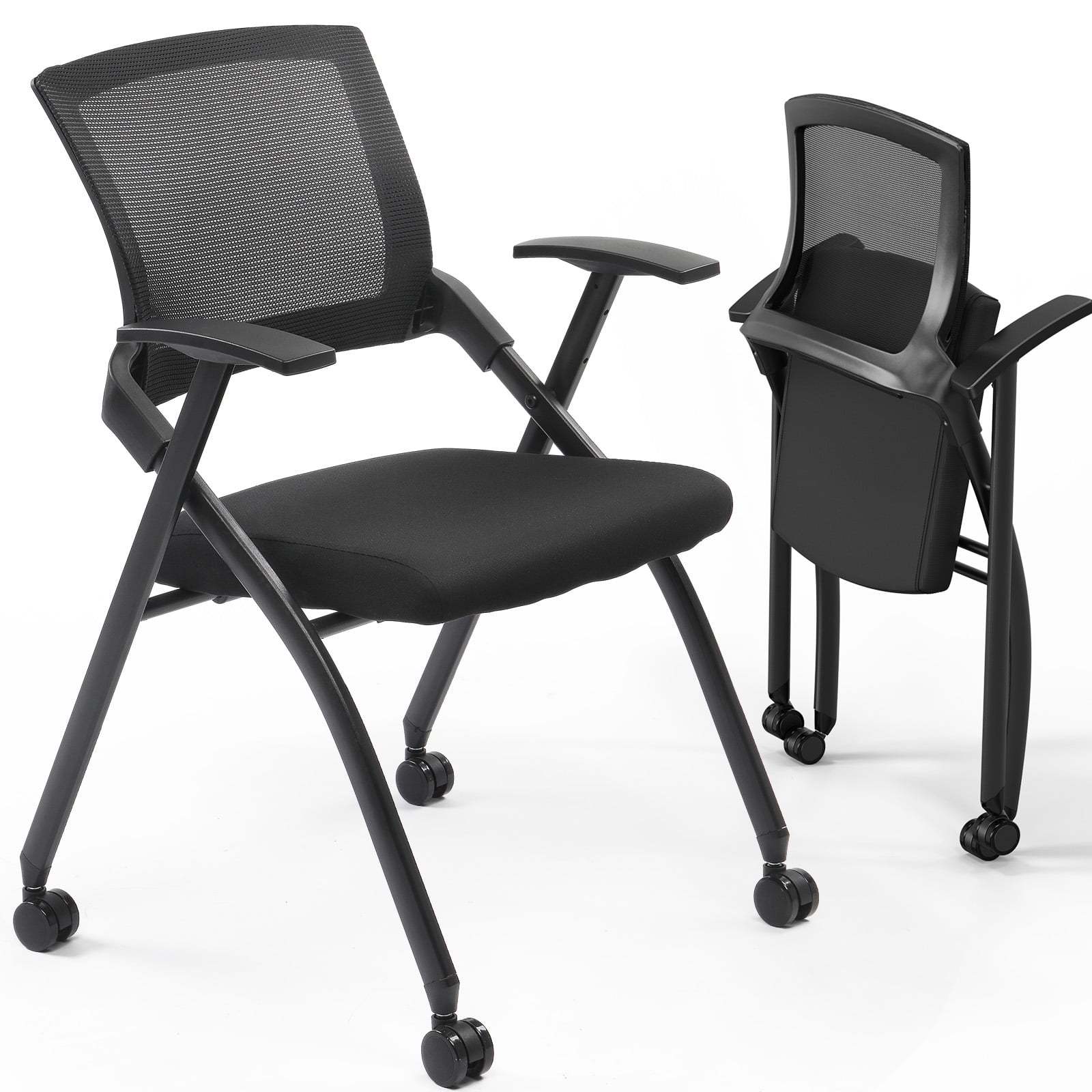 LEADZM Conference Room Chair Folding Office Chair Stackable Side Chair with Wheels and Adjustable Armrest For Home Meeting Furniture 2 Pack, Black